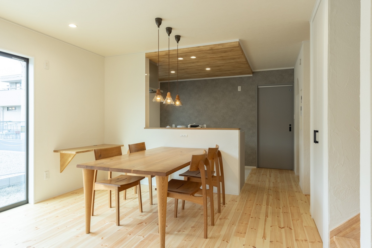 ダイニングキッチンは木目の下がり天井と