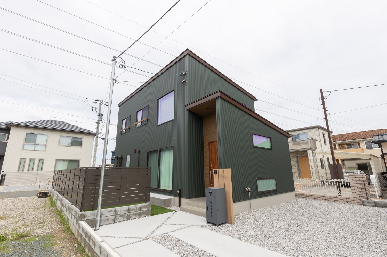 グリーンのガルバリウムと木目の張り分けで