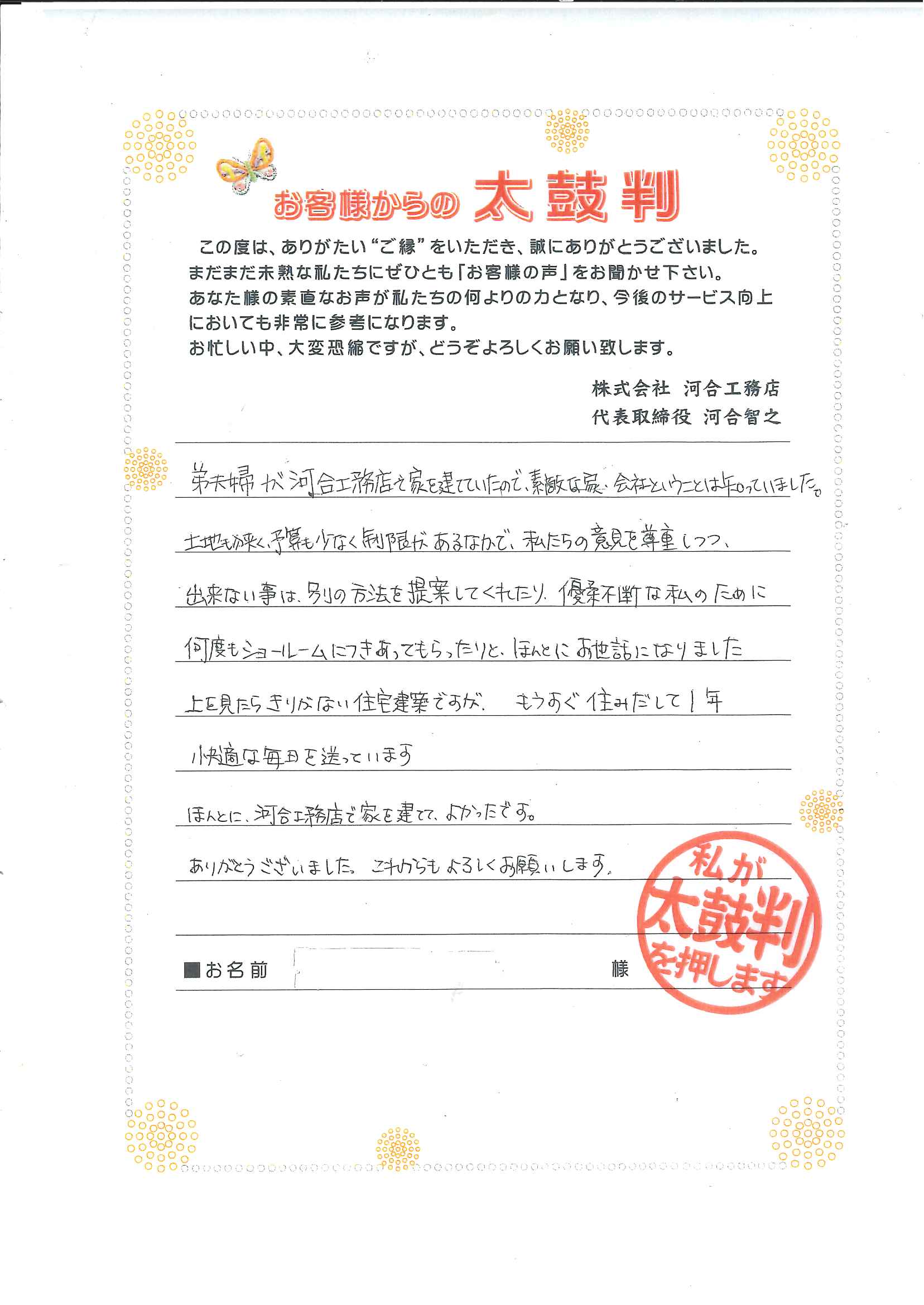 快適な毎日を送っています。河合工務店で建ててよかったです!
